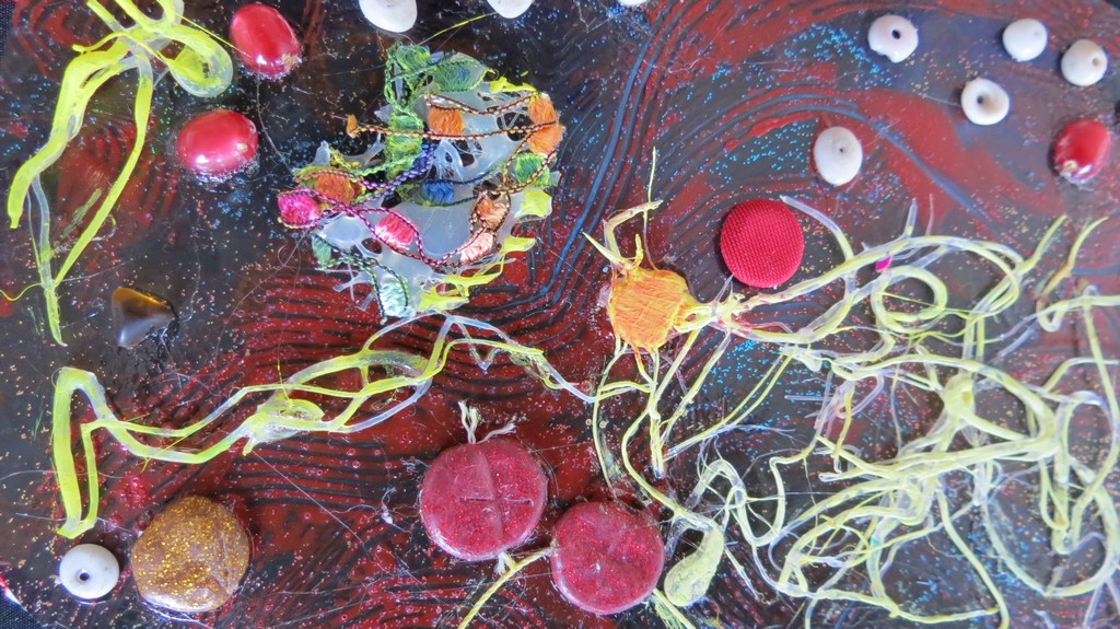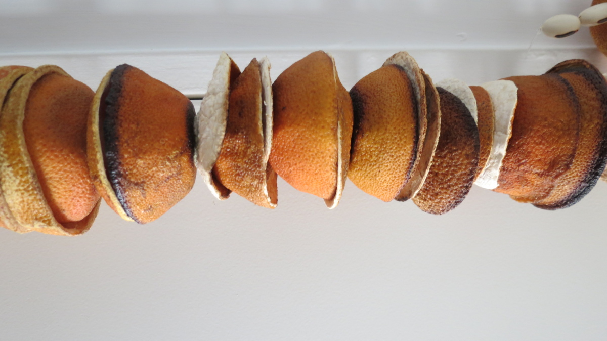 Sume ramas, un tronco y la pulpa de la naranja a la que teñí con remolacha.